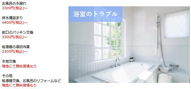 奈良県で対応可能なお風呂(浴室)の修理サービスとなります。その他のトラブルはお気軽に受付スタッフまでご相談ください。